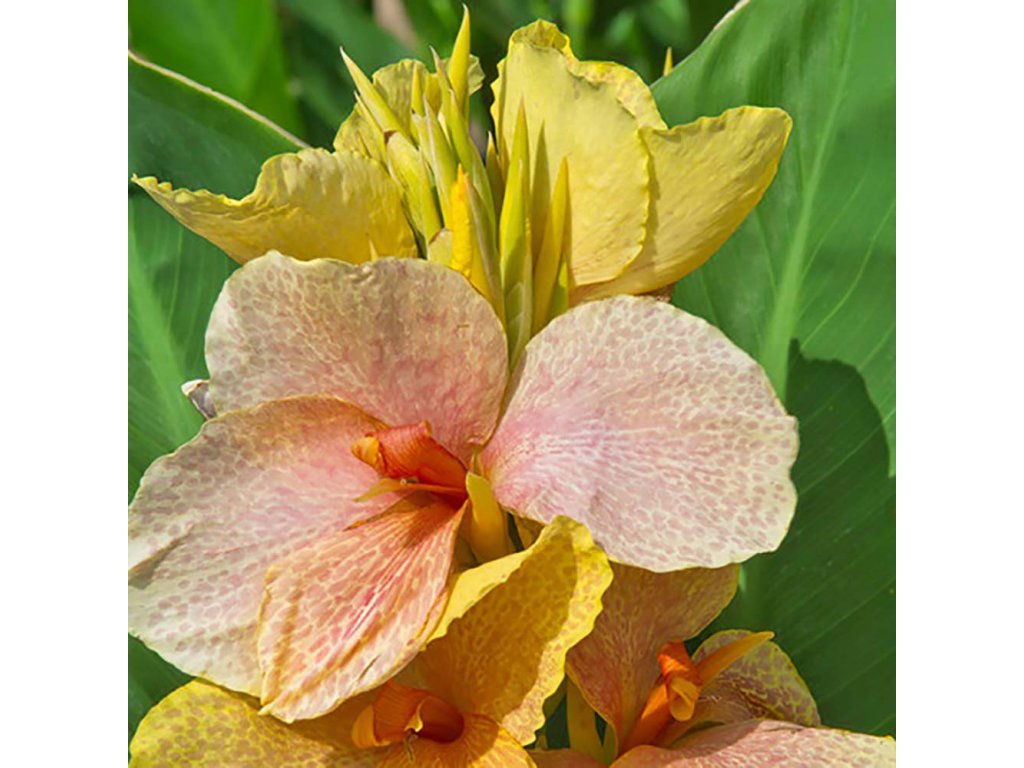 Novinka. Chameleon z Madagaskaru. Světle zelený list se žilnatinou a meruňkový květ s oranžovou kresbou dorůstající 160 cm. Záplava květů, velmi rychle se rozrůstající.