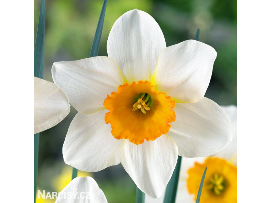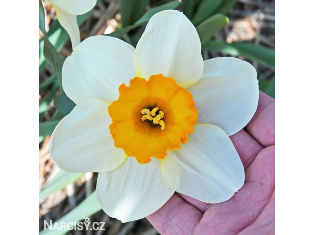 Báječná odrůda s velikým, plochým květem. Krémově bílý květ s pomerančovým kalichem. Skvělý k řezu. Výška 35 cm.