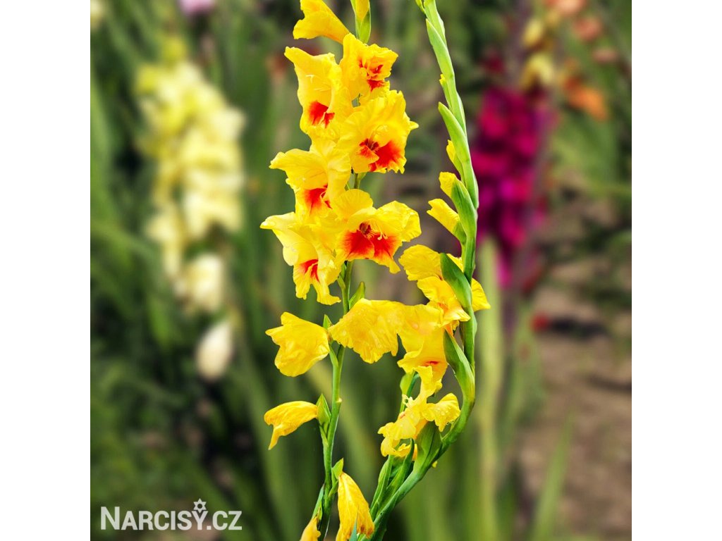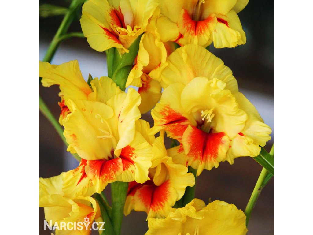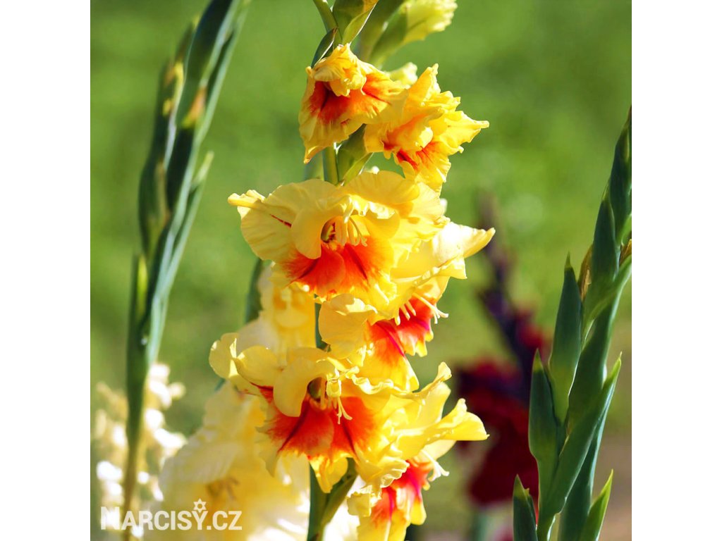 Zlatožluté velké květy s nádherným červeným akcentem na spodních okvětních lístcích. Jeden z nejpopulárnějších mečíků. Výška až 120 cm. Skvělý k řezu.