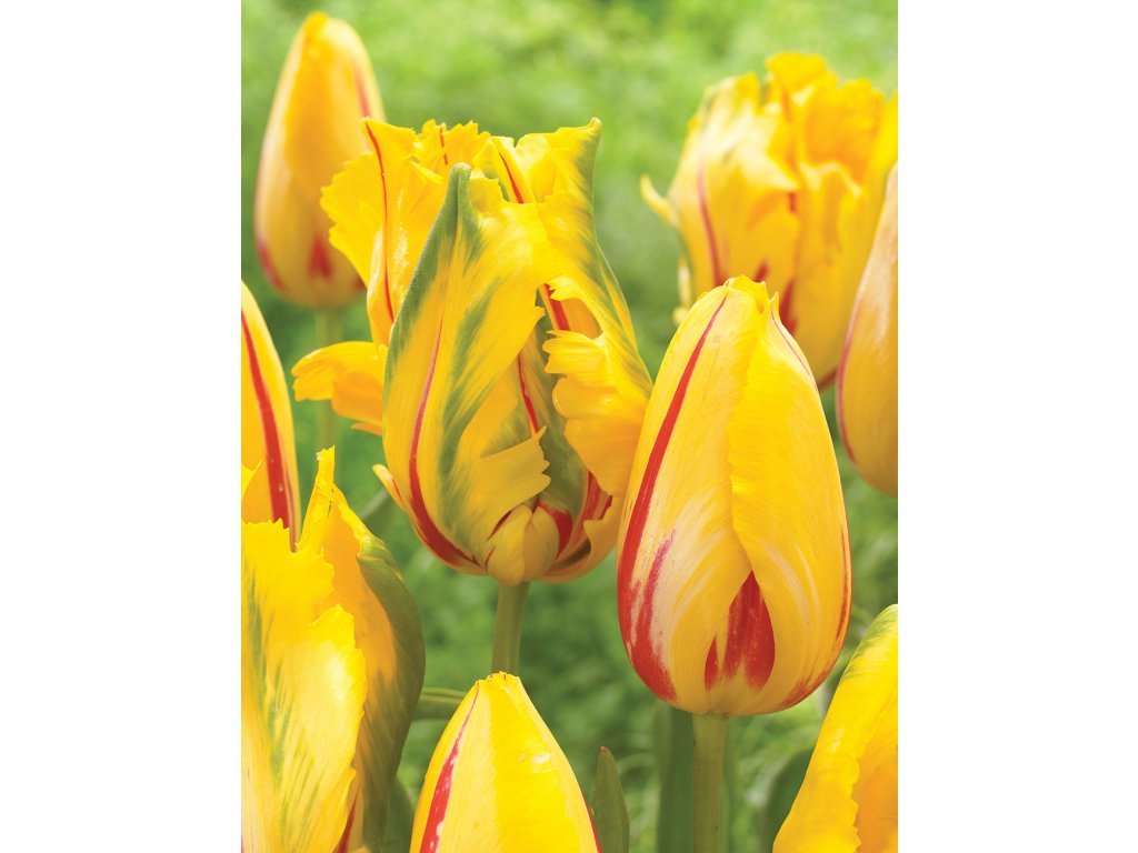 Papouškovité tulipány - unikátní, často vícebarevné květy na pevném stonku. Kvetou od poloviny "tulipánové sezóny" - v dubnu až květnu.
